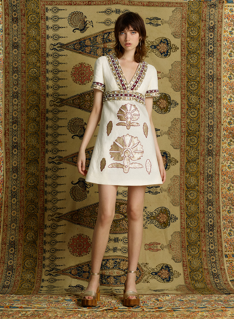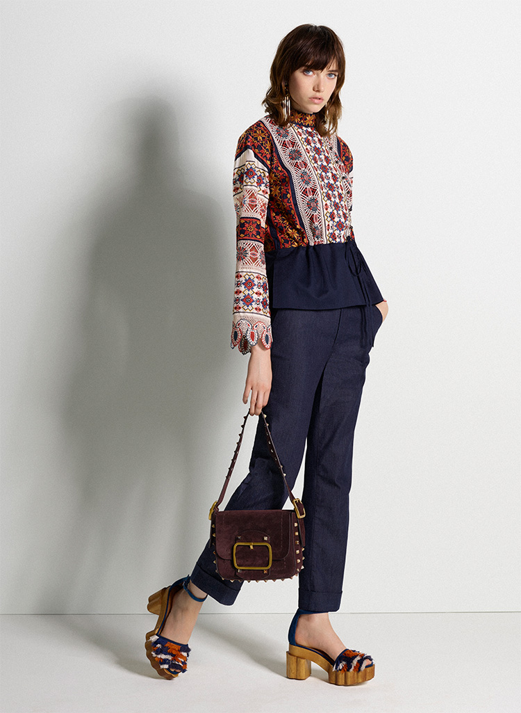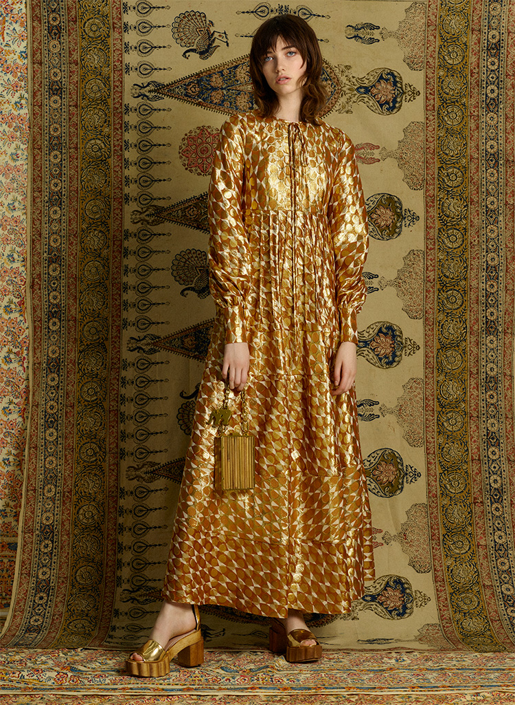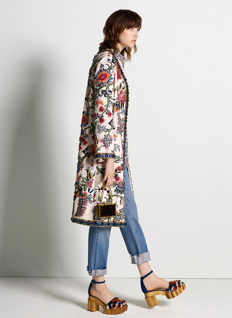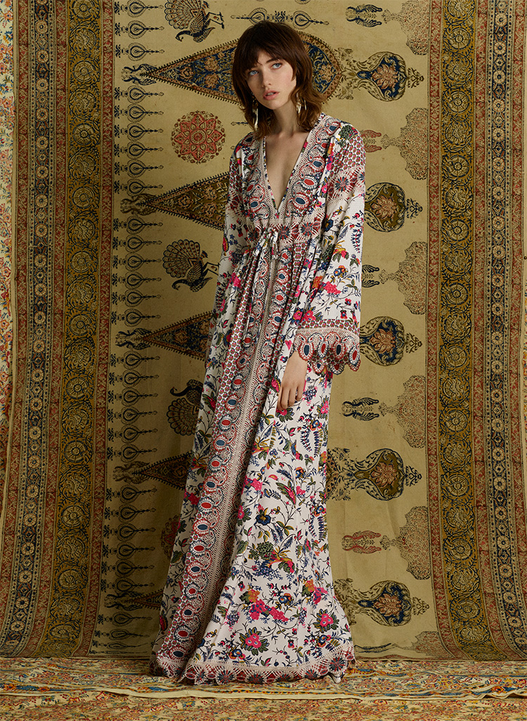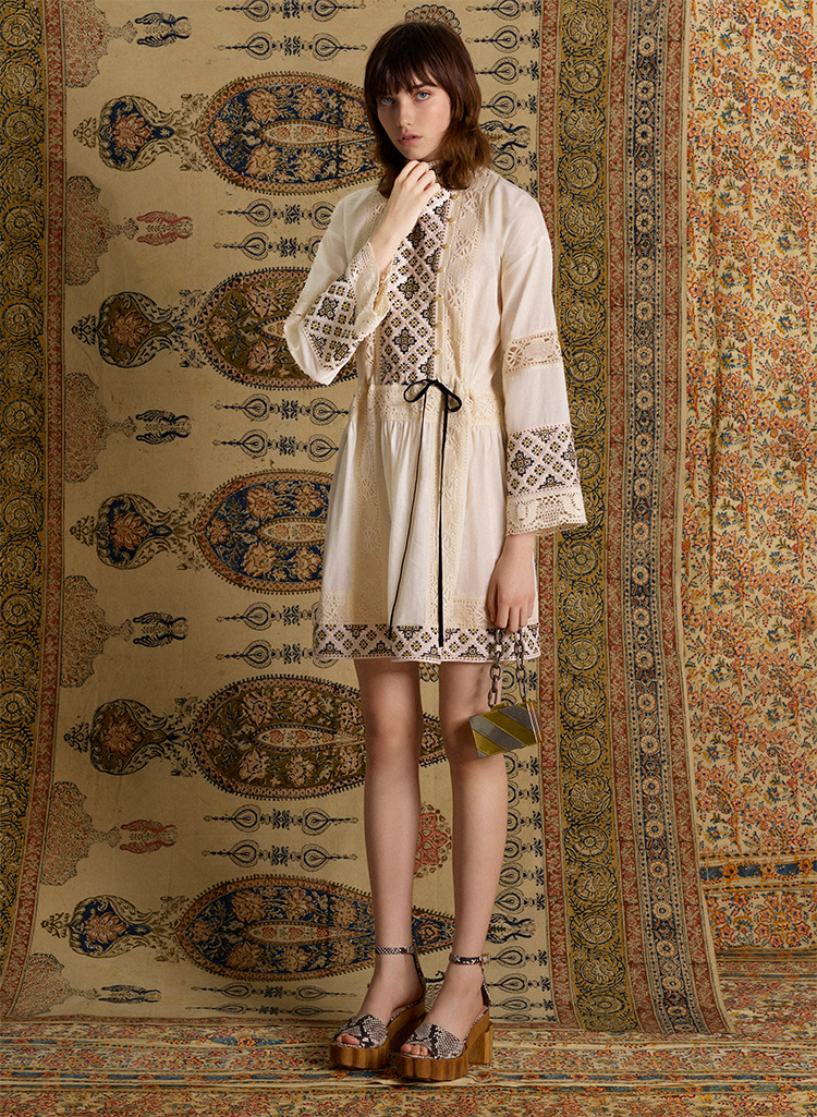 “Pre-Fall 2017 was inspired by Gabriella Crespi’s life — from Milan to India, cosmopolitan to bohemian chic. We paired crisp tailoring and fluid shapes, streamlined and textured fabrics, geometric patterns and rich florals and embroideries. Crespi’s work and her love of natural and mixed materials influenced our accessories: carved-wood platforms, inlaid minaudières and porcupine-quill earrings.” – Tory Burch