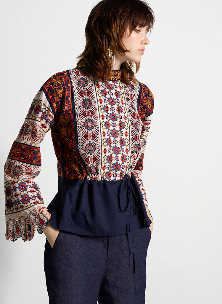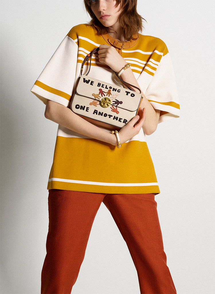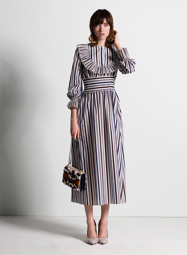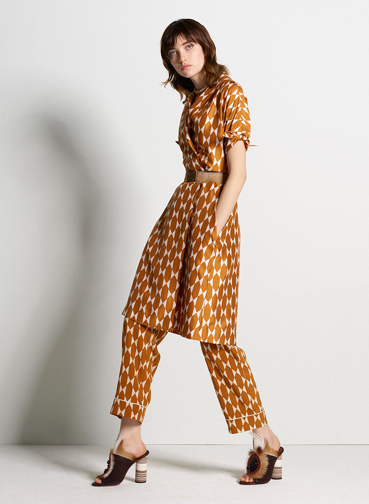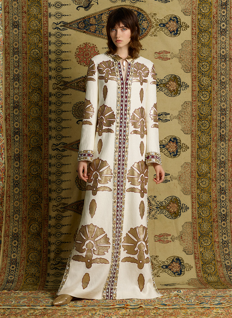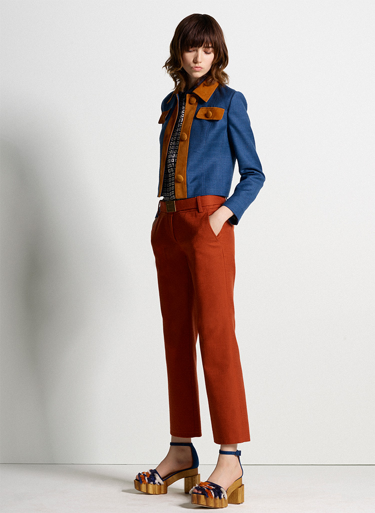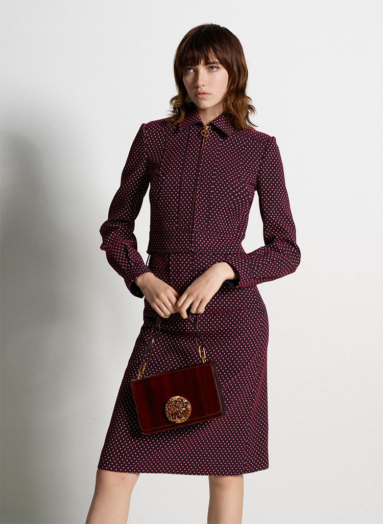 “Pre-Fall 2017 was inspired by Gabriella Crespi’s life — from Milan to India, cosmopolitan to bohemian chic. We paired crisp tailoring and fluid shapes, streamlined and textured fabrics, geometric patterns and rich florals and embroideries. Crespi’s work and her love of natural and mixed materials influenced our accessories: carved-wood platforms, inlaid minaudières and porcupine-quill earrings.” – Tory Burch