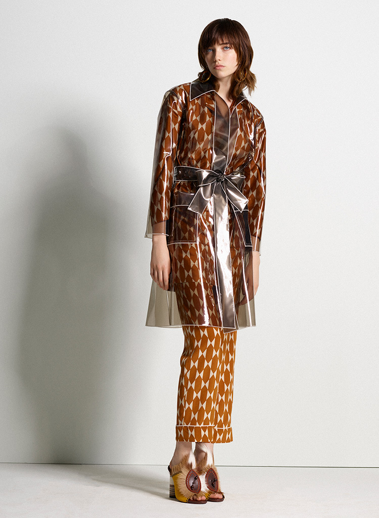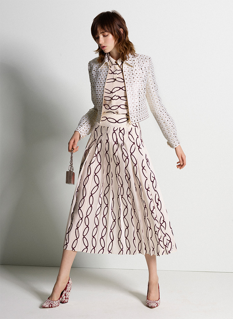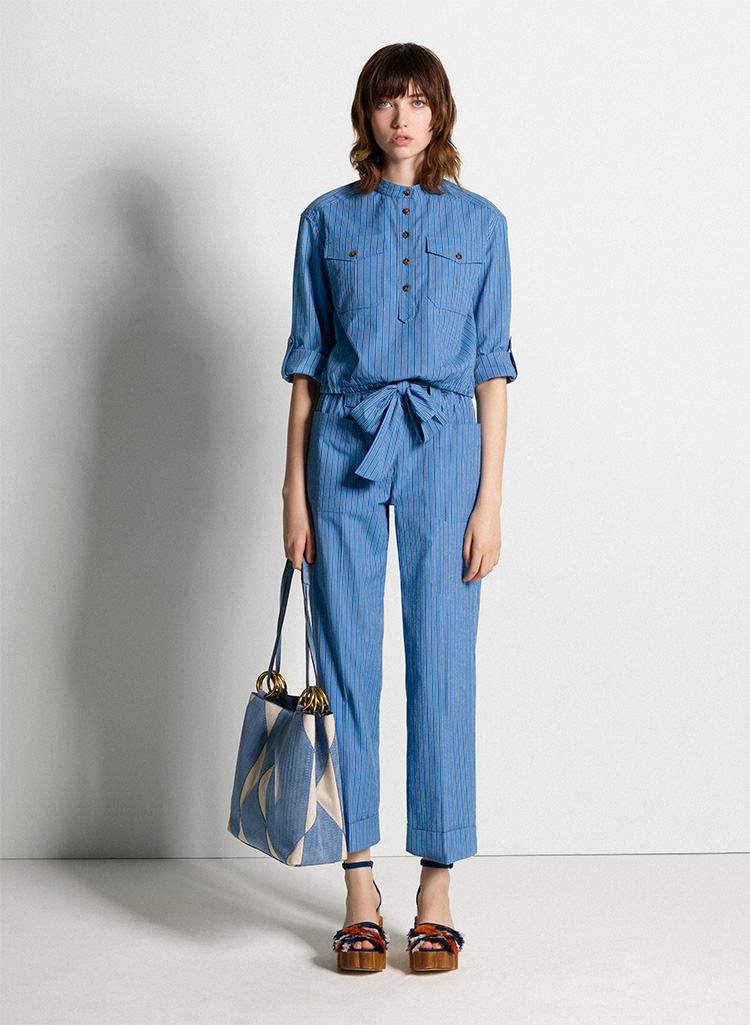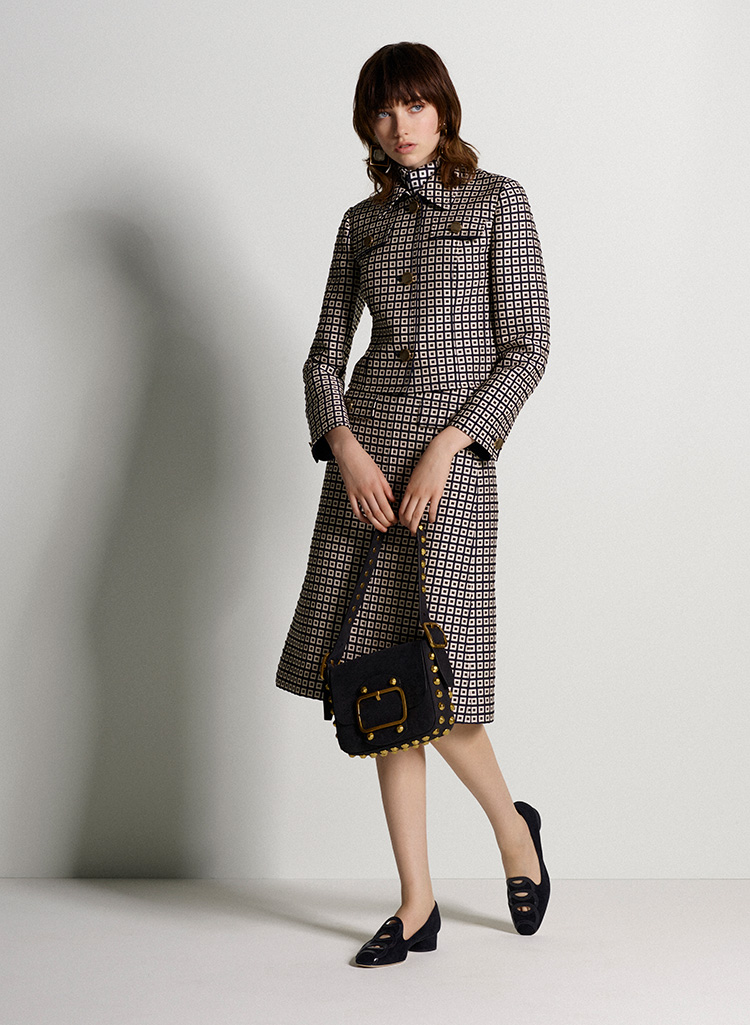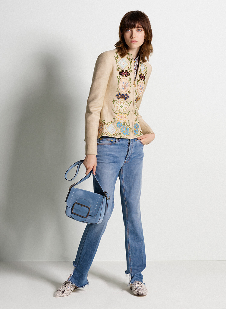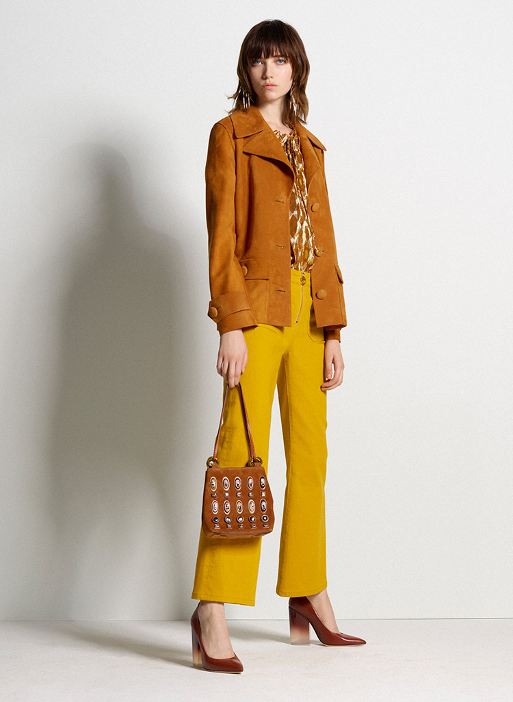 “Pre-Fall 2017 was inspired by Gabriella Crespi’s life — from Milan to India, cosmopolitan to bohemian chic. We paired crisp tailoring and fluid shapes, streamlined and textured fabrics, geometric patterns and rich florals and embroideries. Crespi’s work and her love of natural and mixed materials influenced our accessories: carved-wood platforms, inlaid minaudières and porcupine-quill earrings.” – Tory Burch