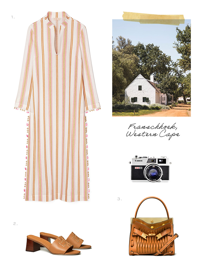 Franschhoek, Western Cape: Keep cool sipping wine in the sun with a lightweight caftan like this one. Add heeled leather sandals and a matching satchel for good measure — and don’t forget your camera!